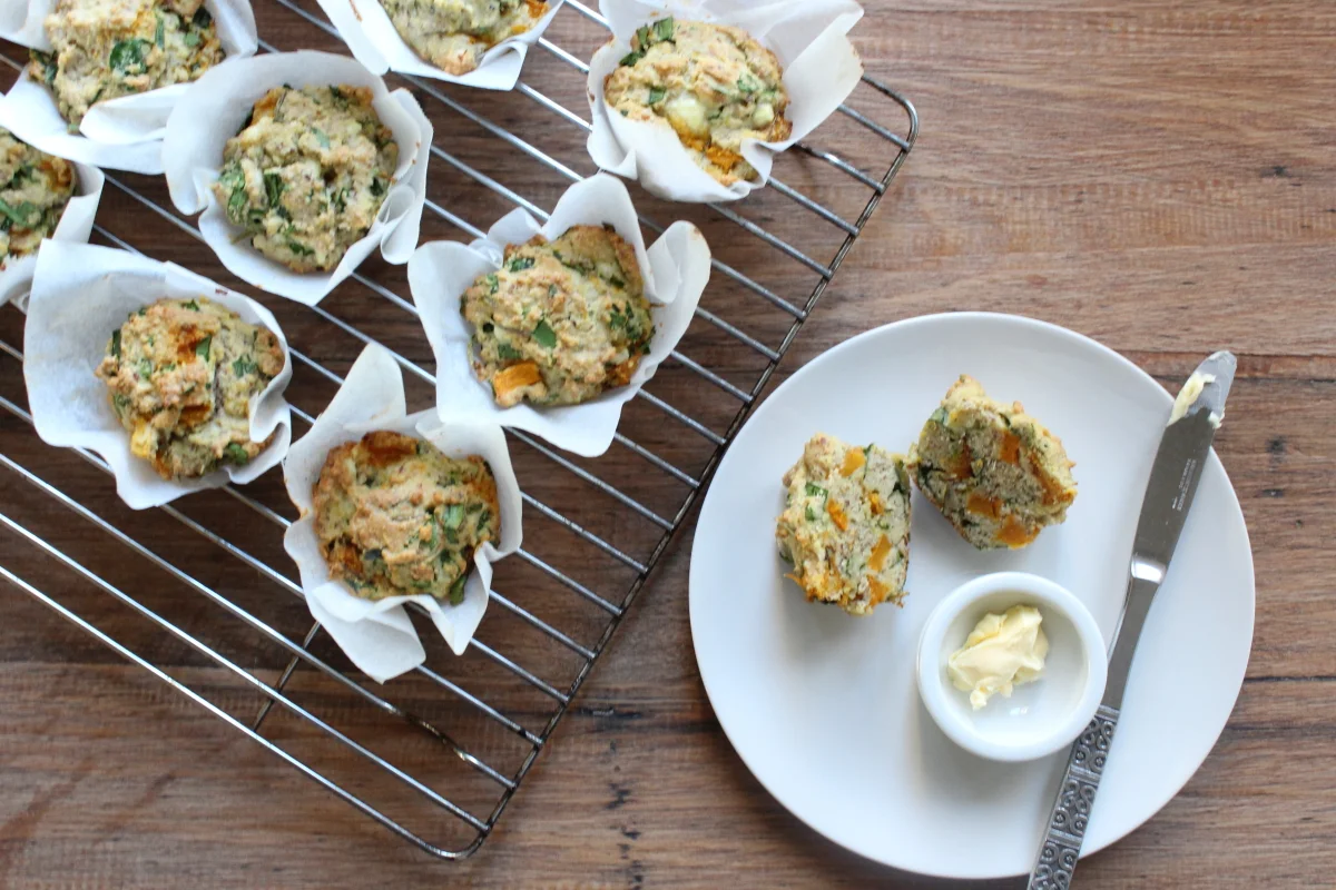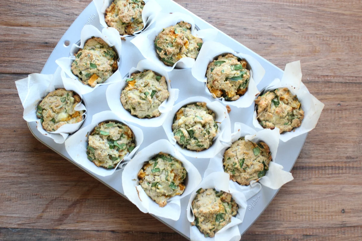 Line a 12 hole muffin tray with baking paper. Combine the flour, almond meal, baking powder, baking soda, salt and pepper in a bowl. Whisk the eggs and then add the wet ingredients to the dry. Also add the spinach, pumpkin and feta and stir until everything is just combined. Turn the oven down to 180°C and spoon the mixture into muffin holes (the mixture will go quite thick so you may need to press it into the holes). Bake for 25-30 minutes or until a skewer comes out dry. Cool in the tray for 10 minutes and then remove to cool completely on a wire rack.