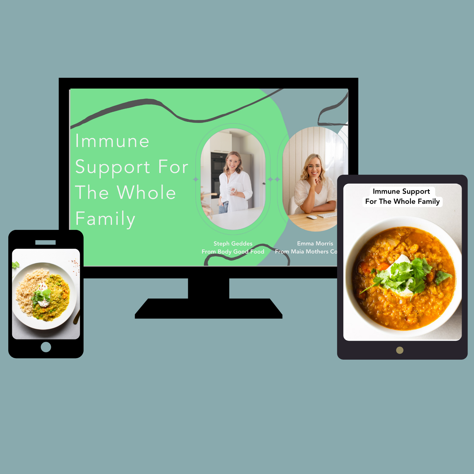 Support the immune health of your whole family with this bundle that includes a 60 minute webinar recording and a 20 page recipe e-book. From foods to supplements, you will get invaluable information you can use to support your family forever.