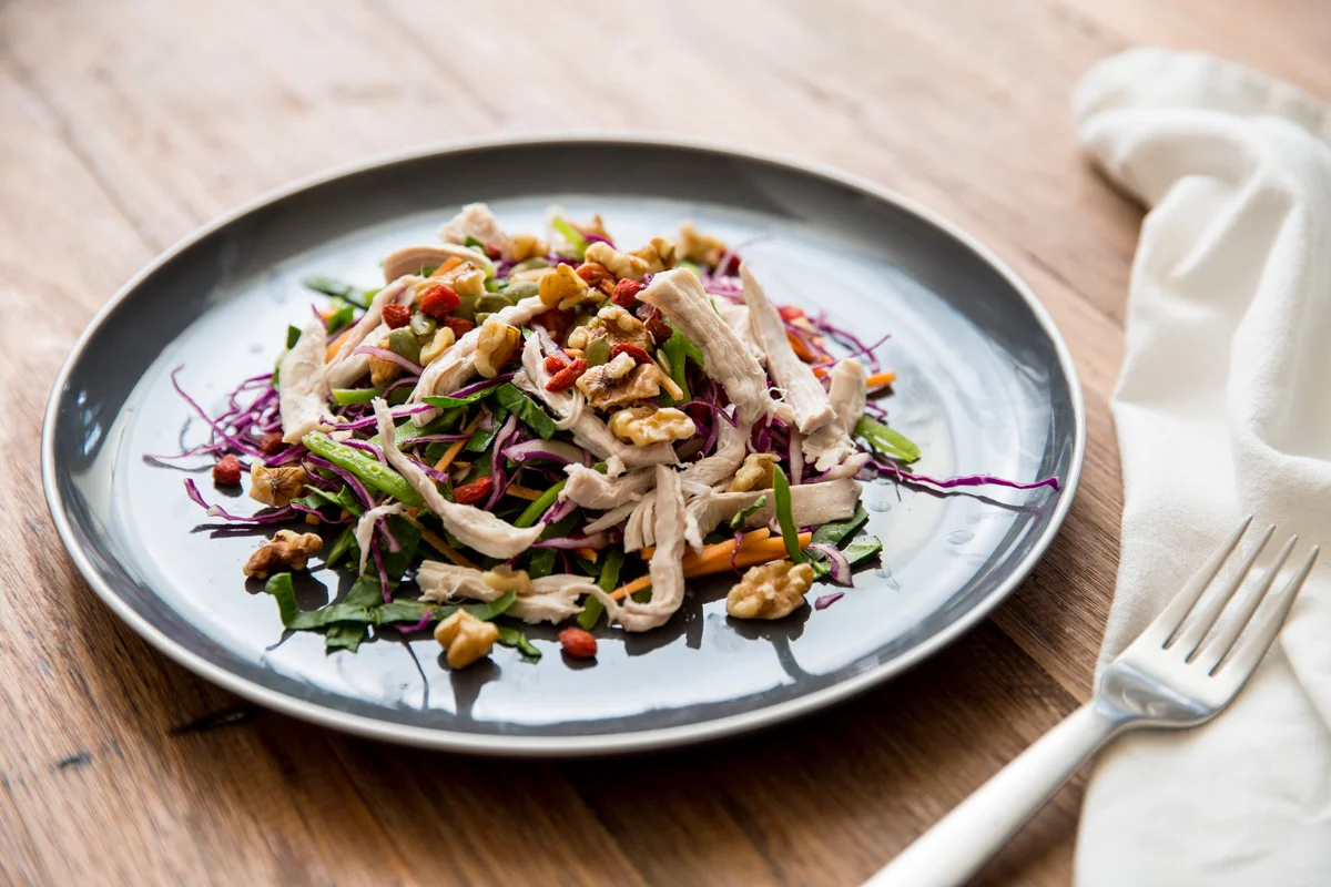 This salad is perfect for warmer weather and easy to whip up and take for lunches. I will often make a batch, keep it separate from the dressing and it will last a few days. What love about this salad is not only that it tastes great but it is full of texture with so many crisp vegetables, shredded chicken, soft sun dried tomatoes, crunchy walnuts and then a creamy dressing. It also looks fantastic with so many bright colours so you can be sure your getting a good mix anti-oxidants and micronutrients. If you are someone with a sensitive tummy or digestive system then try light steaming the veg as an all raw meal for you is not the way to go.