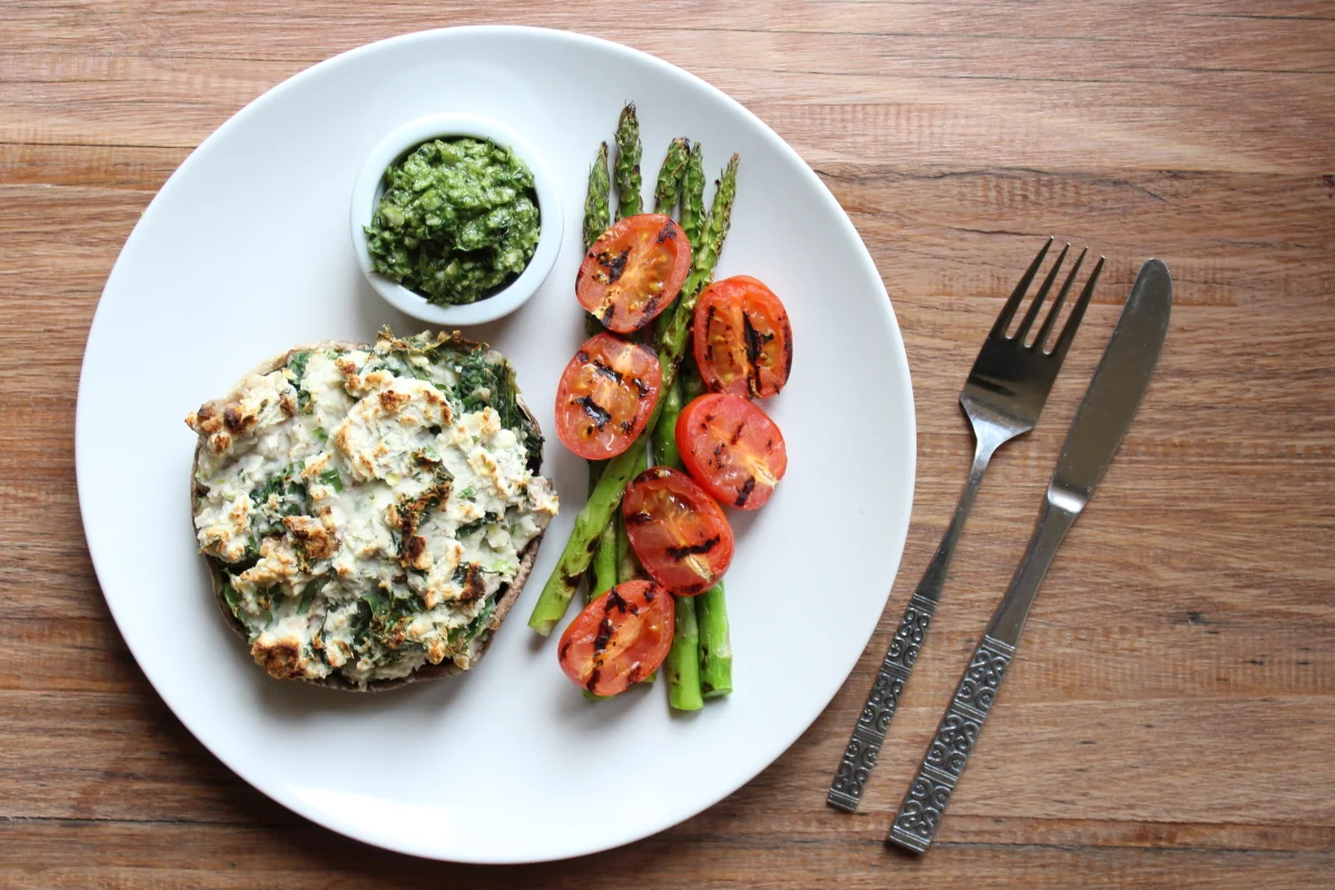 Serve the baked mushroom with grilled vegetables and some pesto.