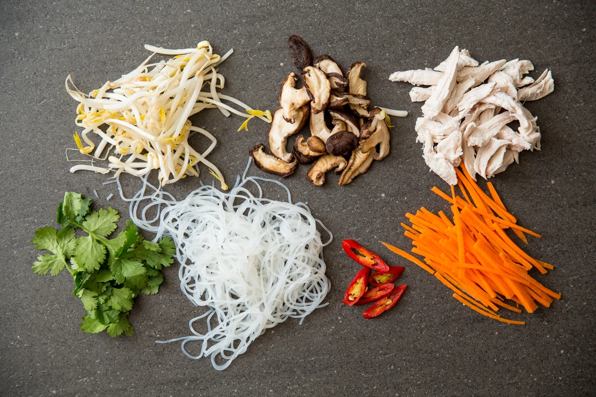 Heat a large pot over low heat and add the water, stock, garlic, ginger, turmeric and chicken until simmering. Add the shiitake mushrooms and carrot and continue to simmer for another 5 minutes or until chicken is cooked through and vegetables are tender. In the last 2 minutes add the bok choy. Meanwhile, place the vermicelli noodles into a bowl and cover with boiling water. When soft, drain and set aside.