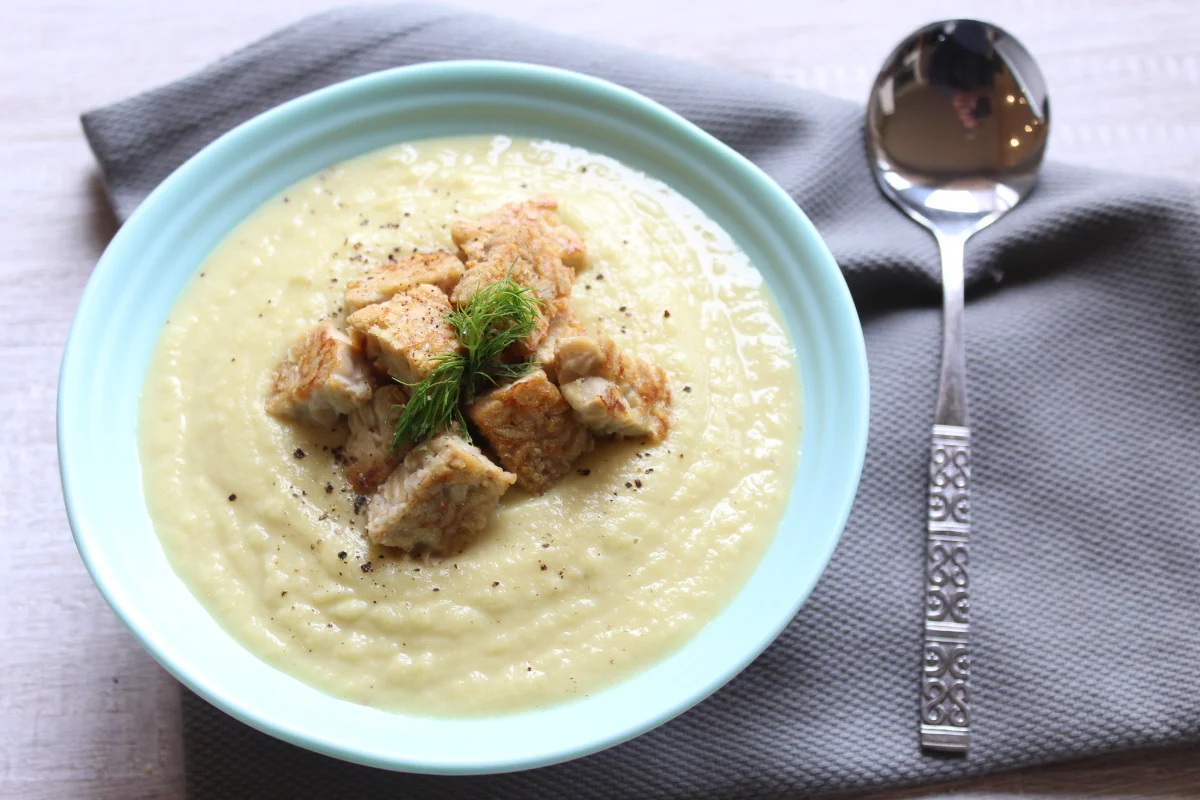 When the garlic is ready remove it from the oven, open the foil and let it cool for a few minutes. Add the roasted cauliflower and fennel to the soup pot and then squeeze out all of the roasted soft garlic from each clove. Simmer for another 5-10 minutes or until the cauliflower is very tender. Blend until smooth.