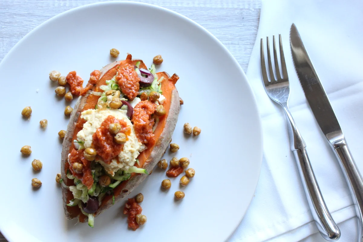 When the sweet potatoes are ready, divide between four plates, top each with some zucchini mixture, then a dollop of hummus and the sundried tomato sauce, and finally top with the roasted chickpeas.