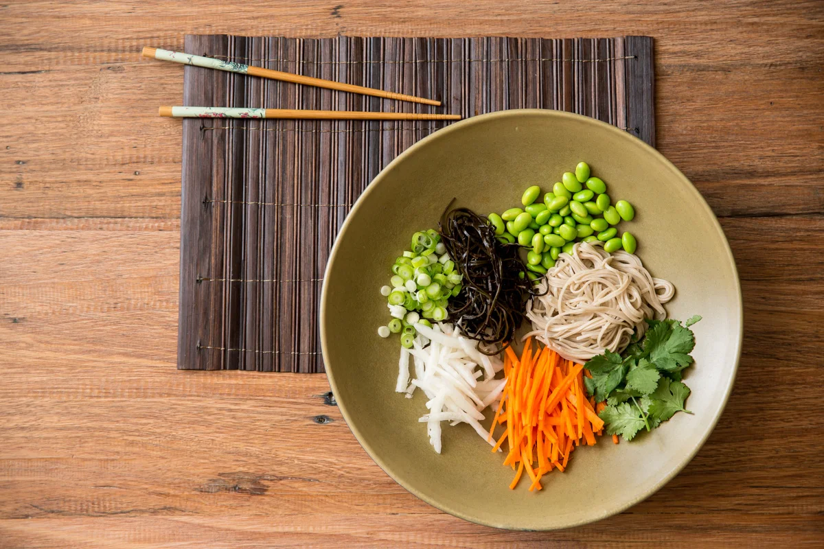 Place the seaweed in a bowl and cover with boiling water for 5 minutes. Rinse and drain and set aside. Meanwhile heat a saucepan of water until boiling and add the noodles. Cook for 3-4 minutes or until al dente. Rinse and drain.