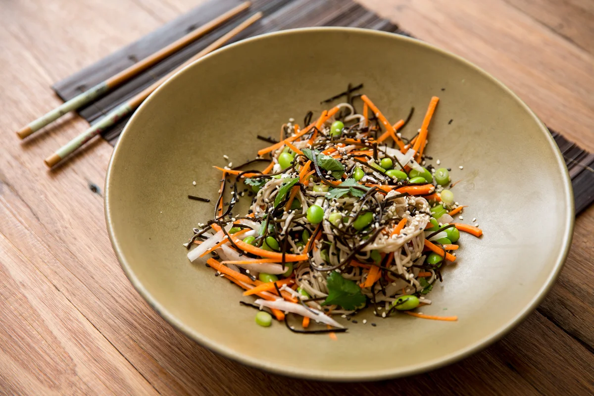 Combine the soba noodles, seaweed, carrot, daikon, spring onion, coriander, chilli, edamame, and sesame seeds in a large bowl. Pour over the dressing and serve with extra fresh coriander.