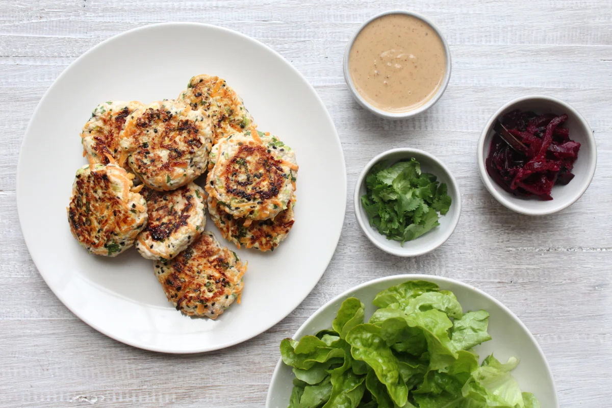 Serve the burger patties with fresh lettuce, cucumber, avocado, beetroot kim chi and miso sauce (and burger buns if you feel like a hearty burger).