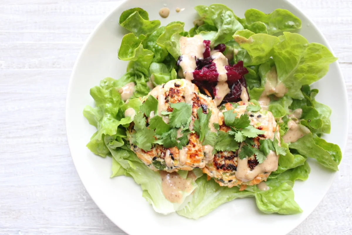 Burger buns are optional, I actually prefer a lighter version of just the burger patties and salad as pictured below, and if you can't find a beetroot kim chi then a beetroot relish or just grated raw beetroot will be fine :)
