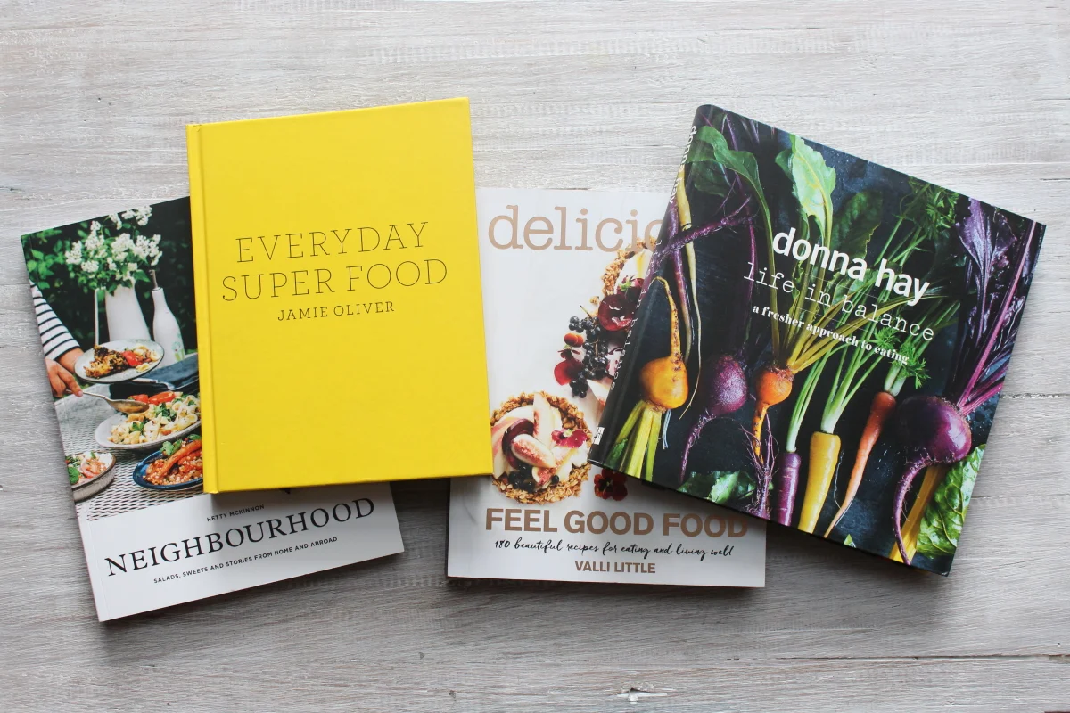 From left to right: Neighbourhood (Hetty McKinnon), Everyday Superfoods (Jamie Oliver), Feel Good Food (Valli Little), Life in Balance (Donna Hay).