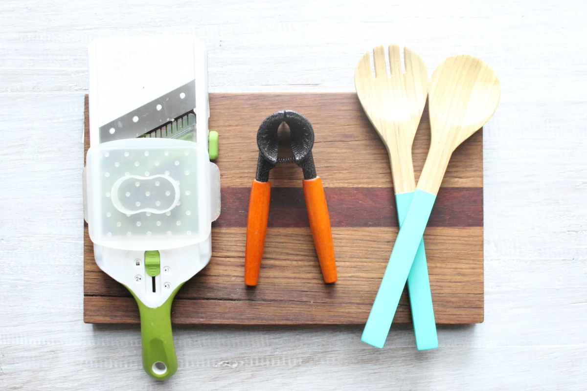There's ones you can't live without, (well I can't live without anyway - mandolin slicer :P) and there's ones that are a nice addition for a special occasion. From left to right: Mandolin slicer (hello zucchini noodles), walnut cracker (beautiful when given with some fresh farmers market walnuts), funky salad servers (can be paired with a bottled jar of your favourite homemade salad dressing), recycled timber chopping/serving board (from the best around - Rawk & Wood).