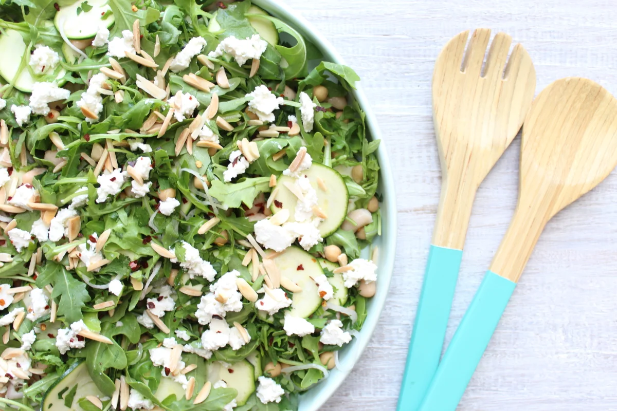 Making up a big batch of salad on the weekend is such a good idea because then lunch for the next 2 -3 days is sorted! I am always trying to come up with different salad combo's because I feel like salad is something people get sick of quite quickly. So this one I have kept vegetarian with the protein coming from the chickpeas and canellini beans and to a lesser extent the almonds and fetta. I always pack in the greens so there's your bitter rocket which helps with digestion and also zucchini. Lastly the salad is complete with some parsley for Vitamin C (which also helps to absorb the non-haem iron from the chickpeas), a kick of chilli and a simple dressing.