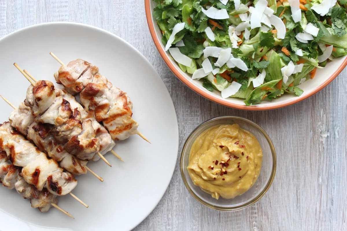 Combine the ingredients for the salad and prepare the dressing. Thread the chicken onto the skewers. Preheat a grill and grill the chicken 4-5minutes each side or until cooked through. Meanwhile, heat a small saucepan on low-medium heat with ½ teaspoon coconut oil and add the shallot for 2-3minutes. Then add the garlic, ginger, chilli and turmeric for 1 minute. Take off the heat and stir in the peanut butter. Add the coconut milk, rice wine vinegar, tamari and maple syrup and then place on low heat and stir until it thickens.