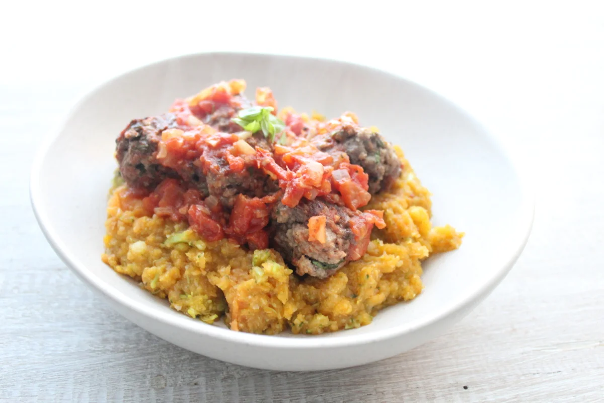 As the weather starts to get cooler what more could you want than a big comforting bowl of meatballs and mash? In this meal I have a twist on the usual mash you might be thinking by adding as many extra veggies as I can - and I also like to serve this dish with added peas sometimes too just to get even more greens in :) Kangaroo is a really great quality protein as it is very lean but you can substitute for beef or lamb if you can't source any.