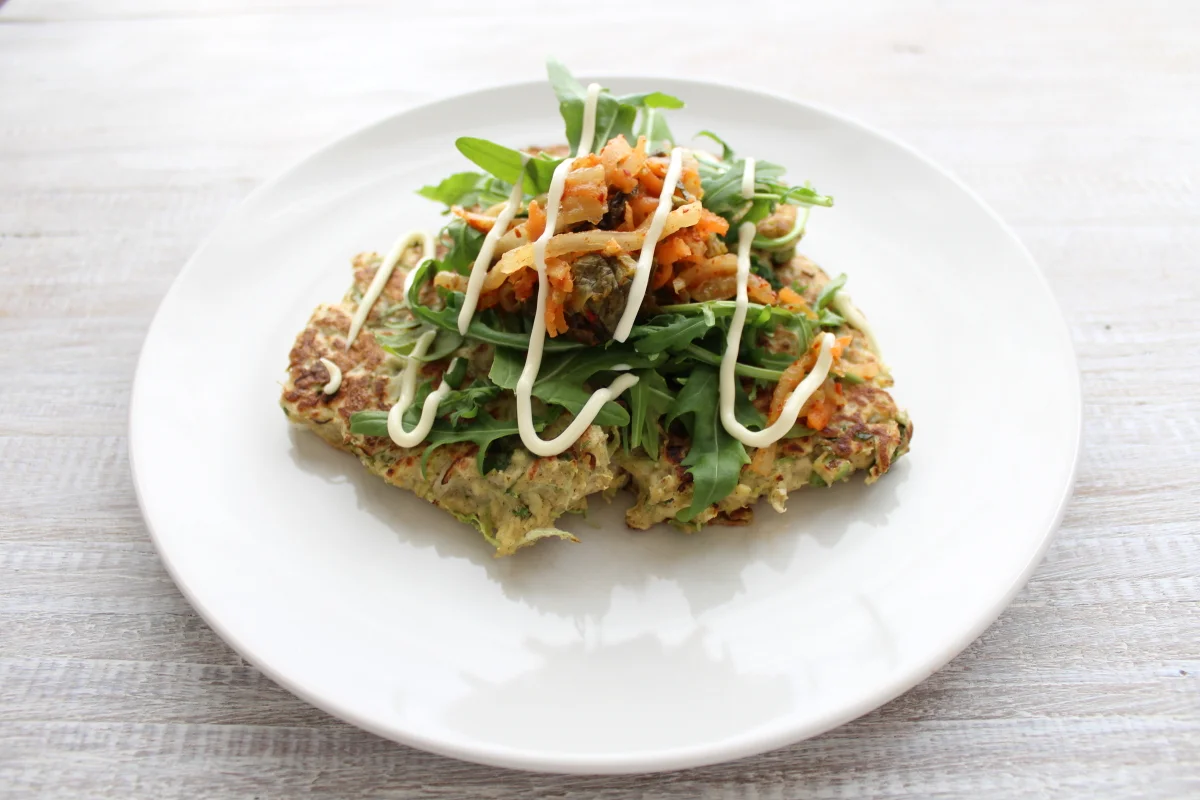 Cabbage is such a great food, it's high in anti-oxidants and it's great for the liver but it tends to be a veggie not many people love! Tofu can also be a hard one to win people over with but it's an excellent source of plant protein and high in calcium. So when I had not much in the fridge but these two ingredients I had the idea to turn them into fritters, kind of like my version of Okonomyaki (Japanese savoury pancake for those who haven't had the pleasure of trying this), and they turned out delicious! As always, I try to boost the nutritional content of my meals as much as I can so I served it with rocket, avocado and kim chi - plus a drizzle of kecap manis and kewpie mayonnaise (because you can't have Okonomiyaki without it!).