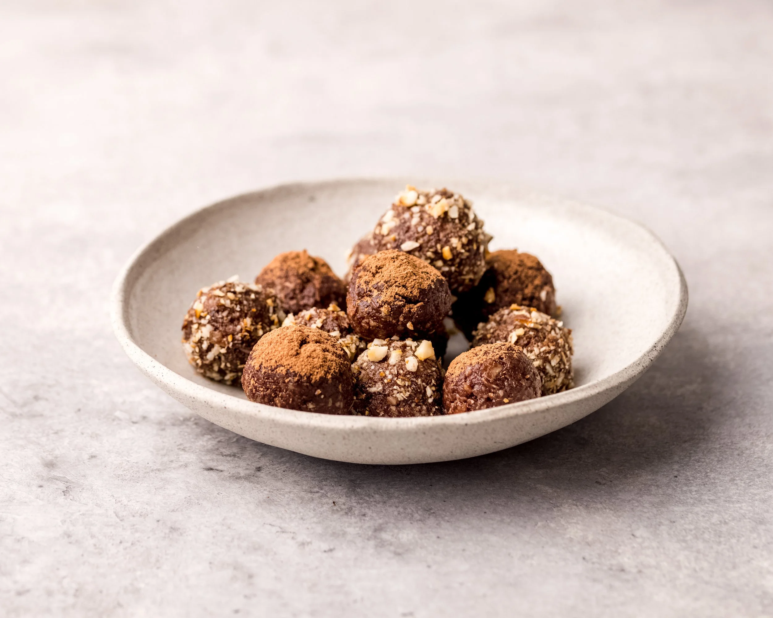 Blitz all ingredients in a high speed blender/food processor. Roll in crushed macadamia or dessicated coconut if you wish.