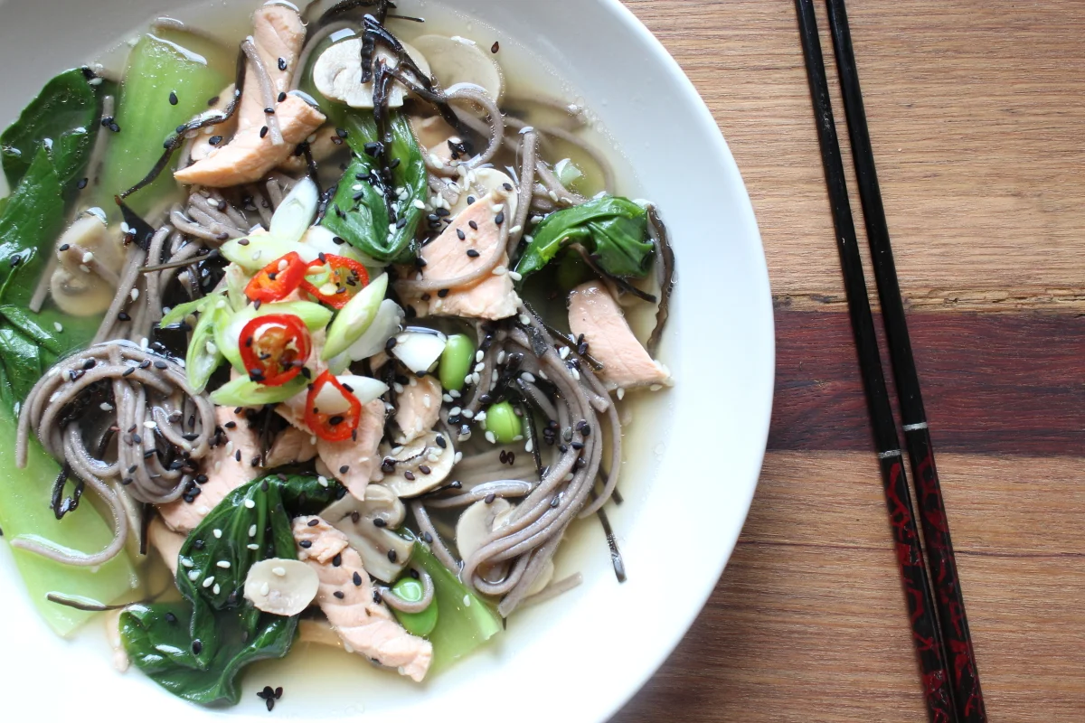 This is my idea of heaven. Especially seeing Melbourne has decided to turn up the winter dial all of a sudden! Salmon is a fantastic source of omega-3 fatty acids and if you find little bones in yours, don't stress, they provide you with calcium so I suggest you gobble them up. Sea weed is so underrated in my eyes and gives you plenty of Vitamin A, C, calcium and antioxidants as well as providing a great source of iodine. Edamame beans are high in protein and fibre and we have bok choy, mushrooms and soba noodles to boost the fibre content even further. Warming, nourishing and super delicious!
