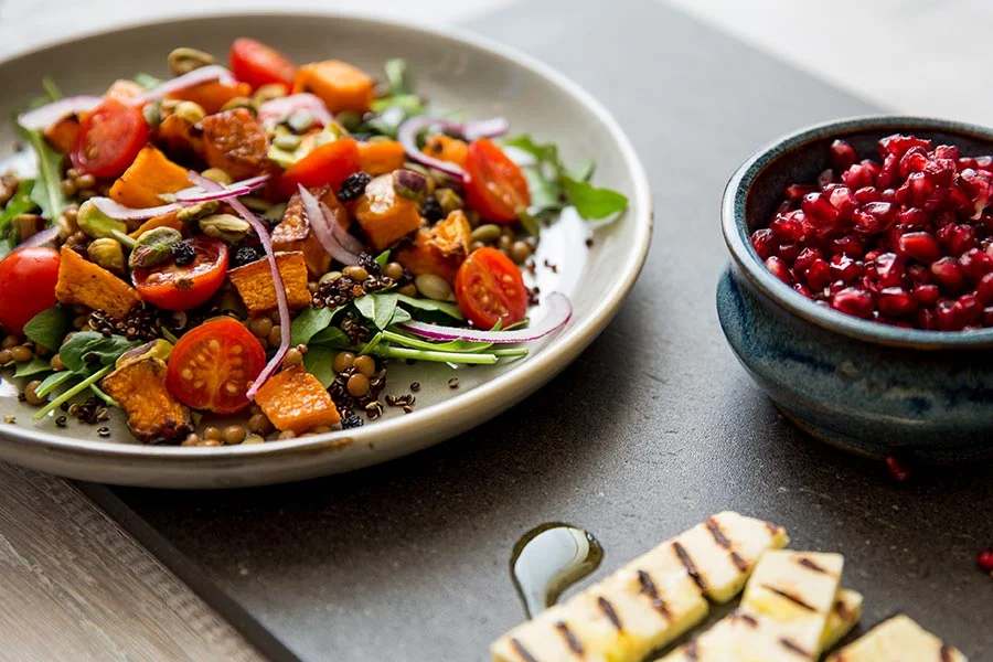 This would have to be one of my all time favourite salads with the combination of roast pumpkin, salty haloumi and pops of sweet pomegranate you just can't go wrong. Quinoa has a fantastic amino acid profile providing a complete vegetarian source of protein as well as being high in calcium, iron, B vitamins and phosphorus.