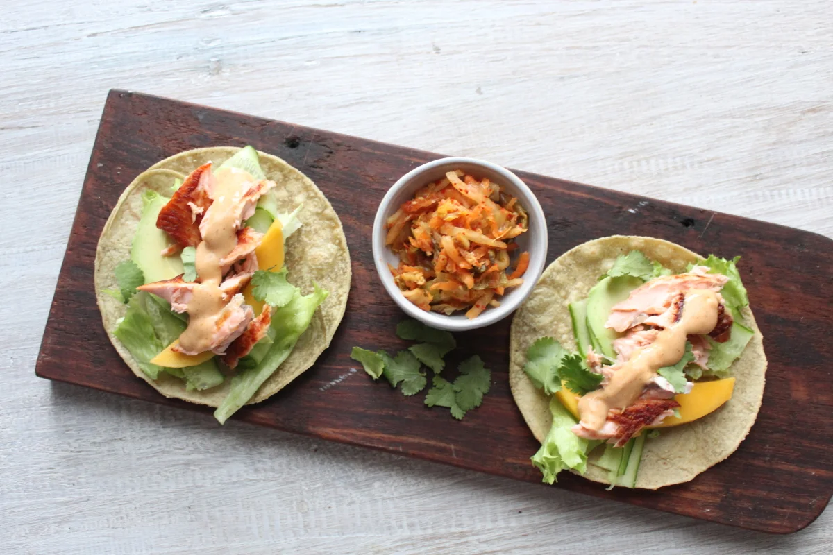 Four of my favourite things combined...tacos, salmon, avocado and kim chi! This recipe is so simple but unbelievably tasty and it would be a great one to do when entertaining.